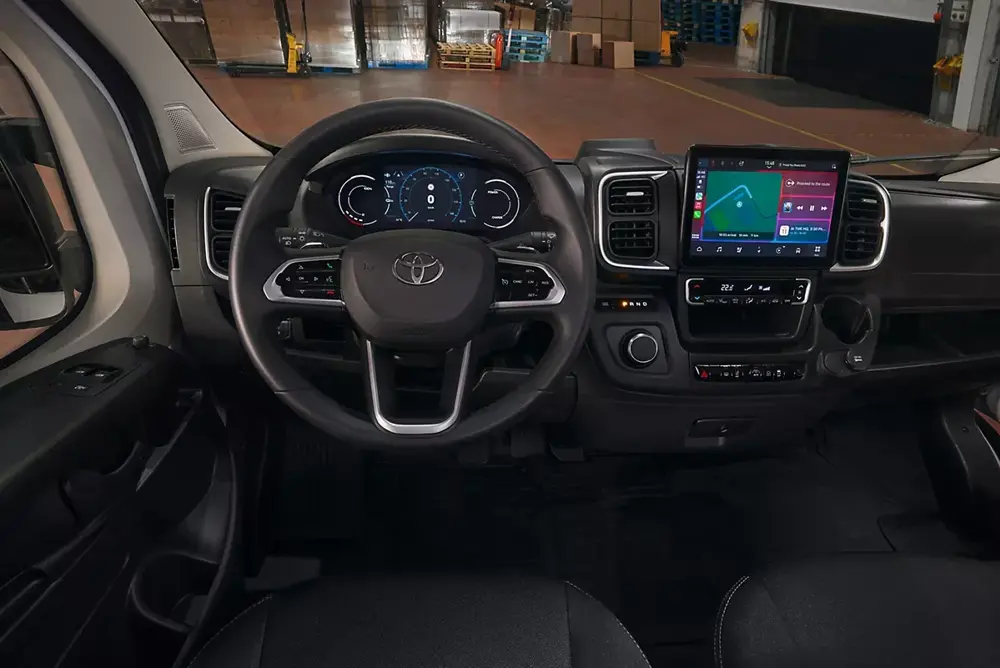 Proace Max har et komfortabelt og klimatiseret rum, hvor man kan arbejde eller slappe af. Der er plads til to eller tre i den stilfulde, rummelige kabine. Toyotas ProTouch-multimediesystem sidder i hjertet af varevognen og har intuitive tilslutningsmuligheder, der betjenes af en 10-tommers touchskærm i høj opløsning.