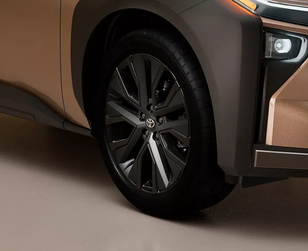 Med 20" alufælge, solide dæk og beskyttende hjulkasser er Toyota bZ4X Touring klar til alle typer terræn med attitude og stil.
